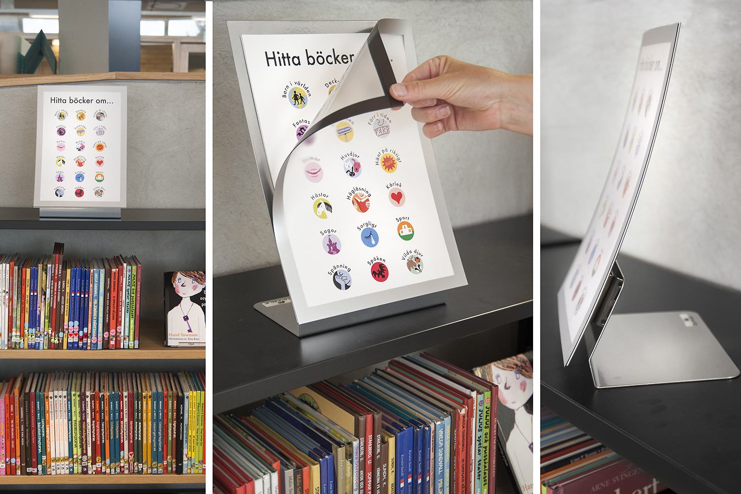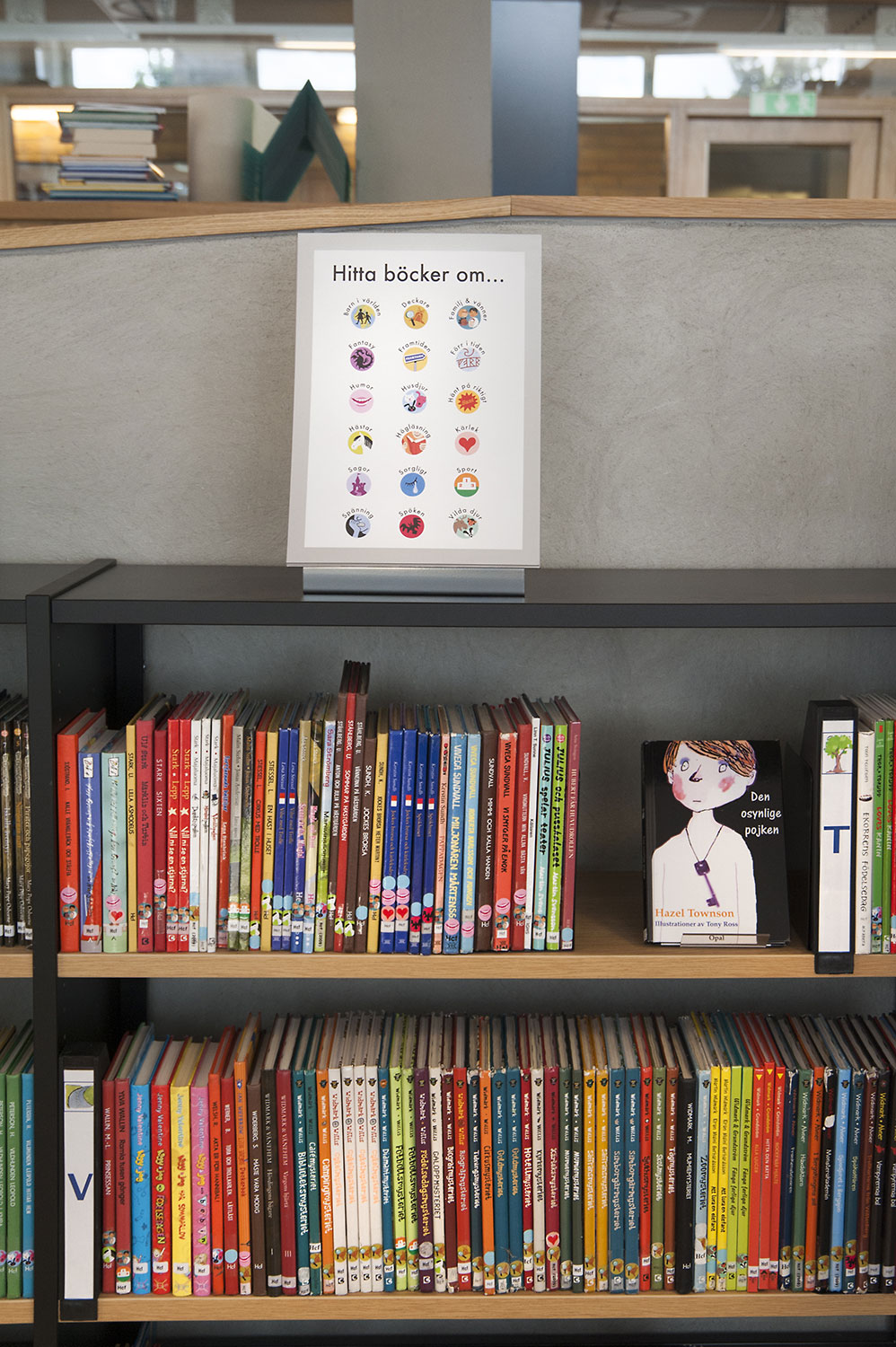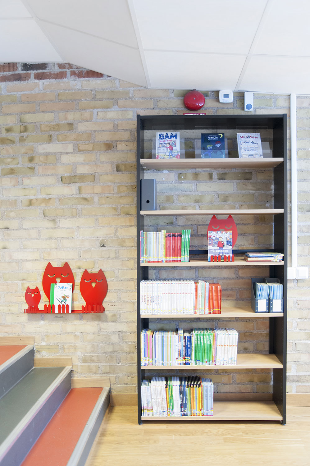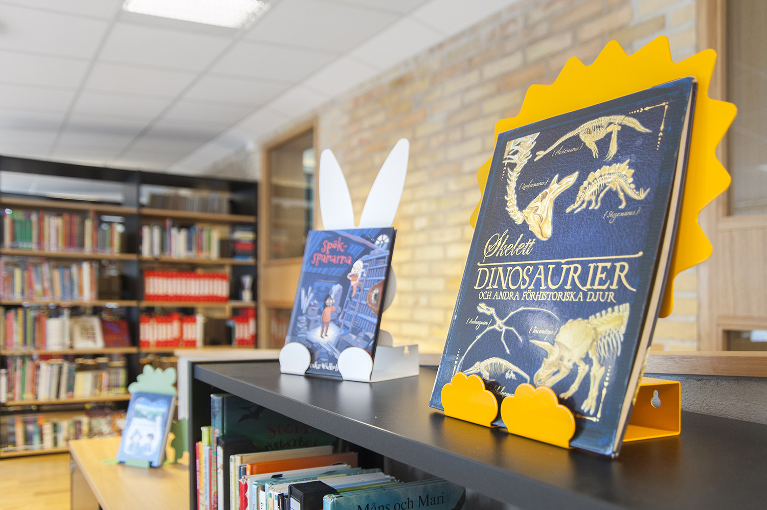 Man satsar mycket på att exponera och tillgängliggöra och använder symboletiketter för att märka upp bokryggar för att bibliotekets innehåll ska vara lätt att hitta. Flera av exponeringsställen i lite roliga format såsom owl, rabbit, wolf, lion används för att visa böcker på ett inspirerande och lustfyllt sätt. Invid lättlästhyllan tronar ugglefamiljen på väggen och visar upp spännande titlar!