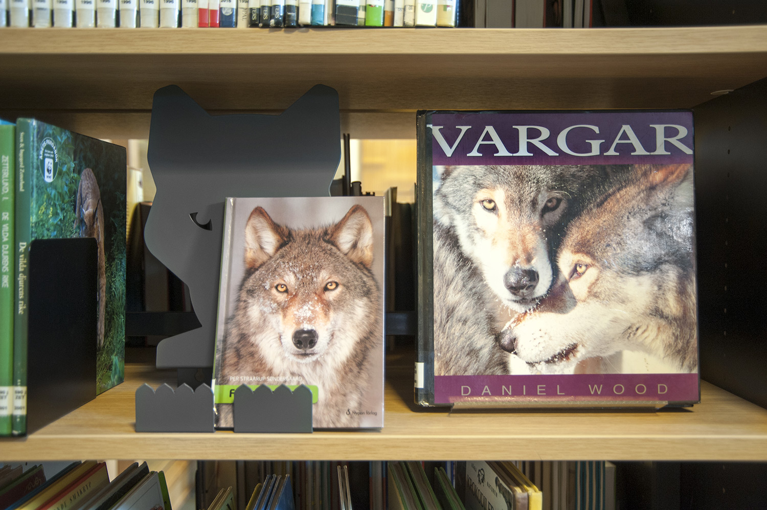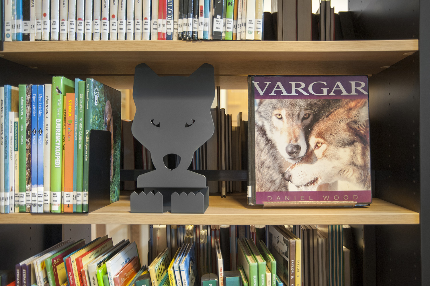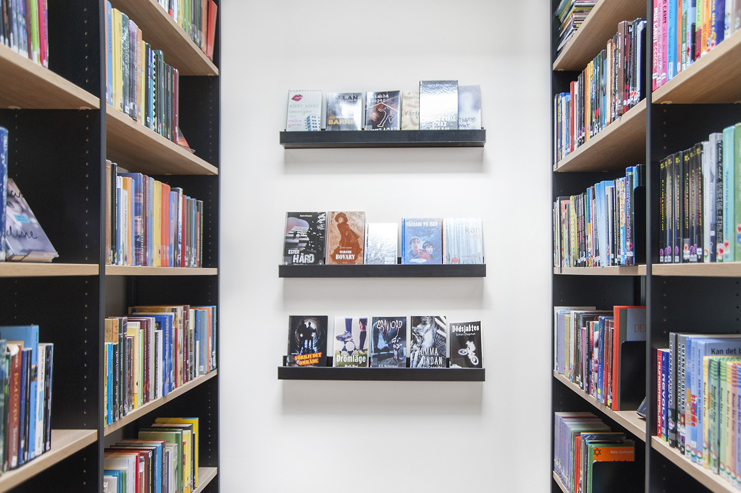 Genomgående i bibliotekets lokaler används Frontlinehyllor med svartlackerade gavlar och hyllplan i ekfaner som kompletteras av en disk i samma färgställning samt bokvagnar från Plus-serien.
