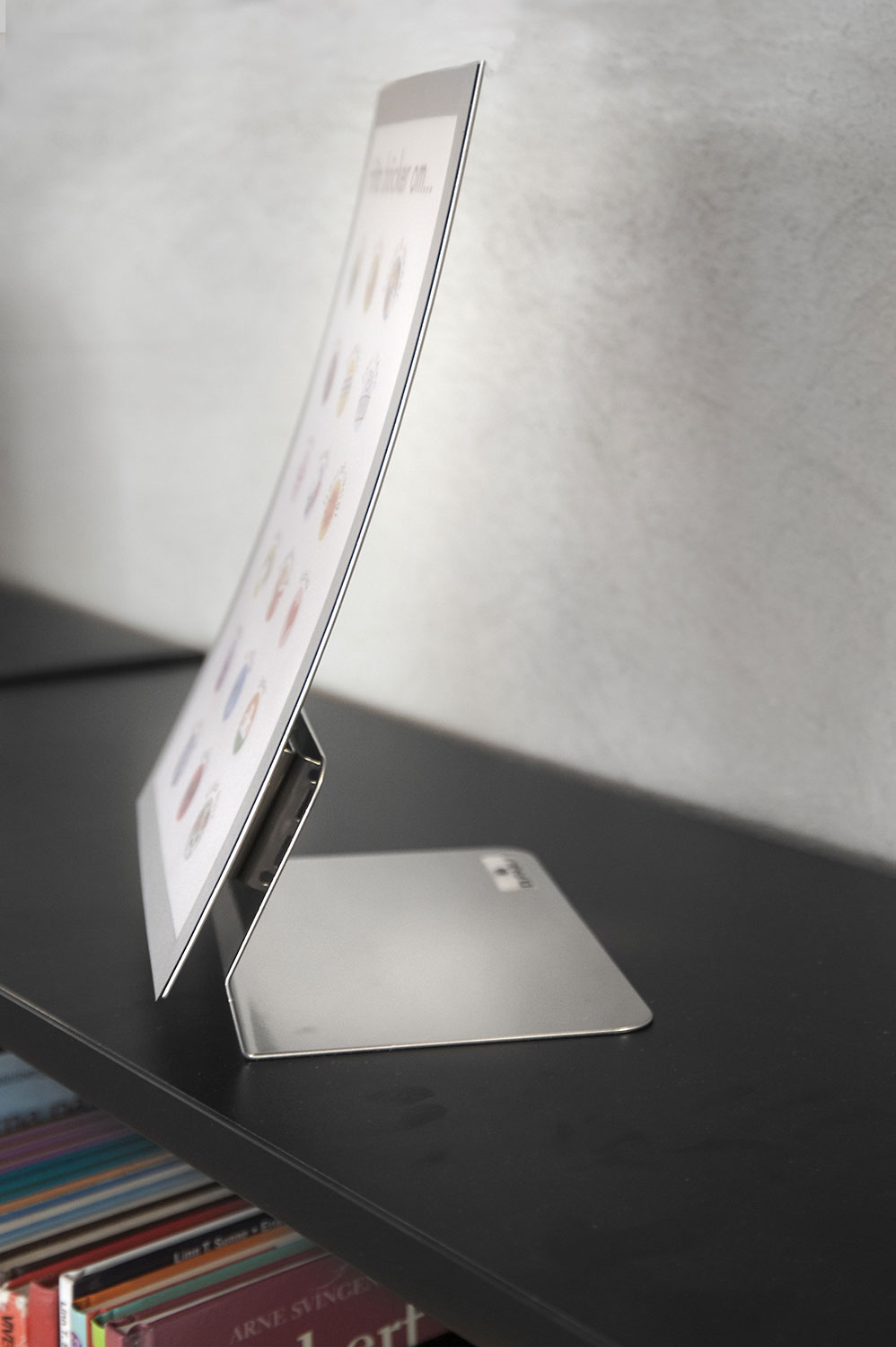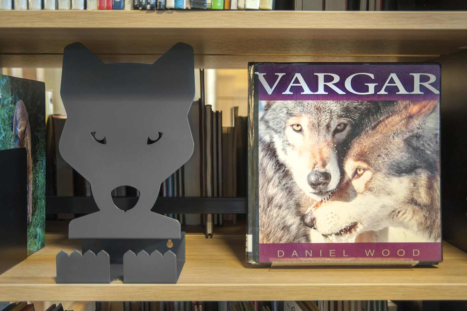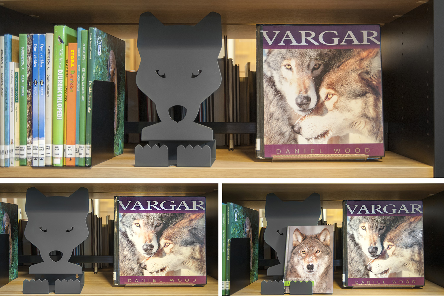 Genomgående i bibliotekets lokaler används Frontlinehyllor med svartlackerade gavlar och hyllplan i ekfaner som kompletteras av en disk i samma färgställning samt bokvagnar från Plus-serien.