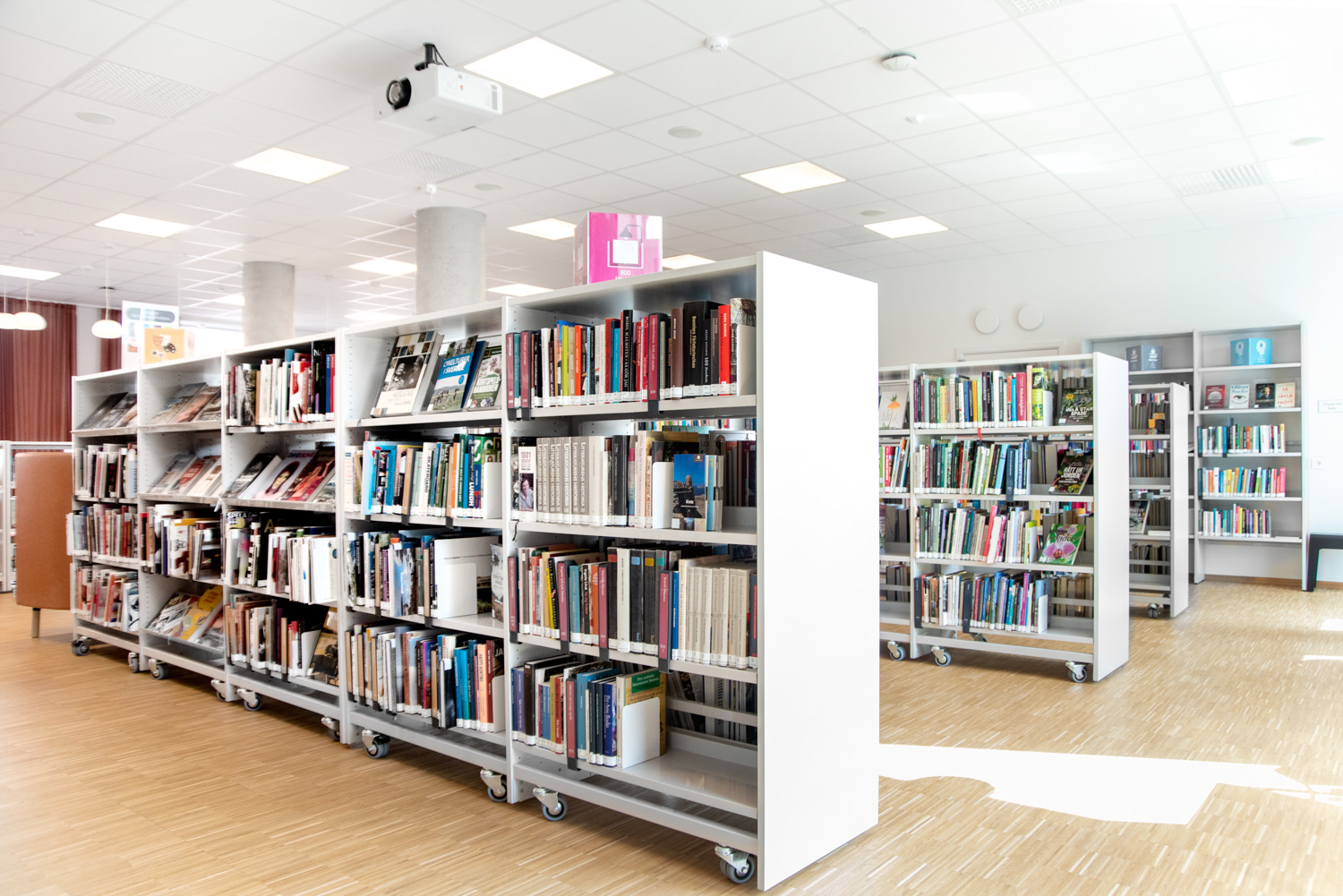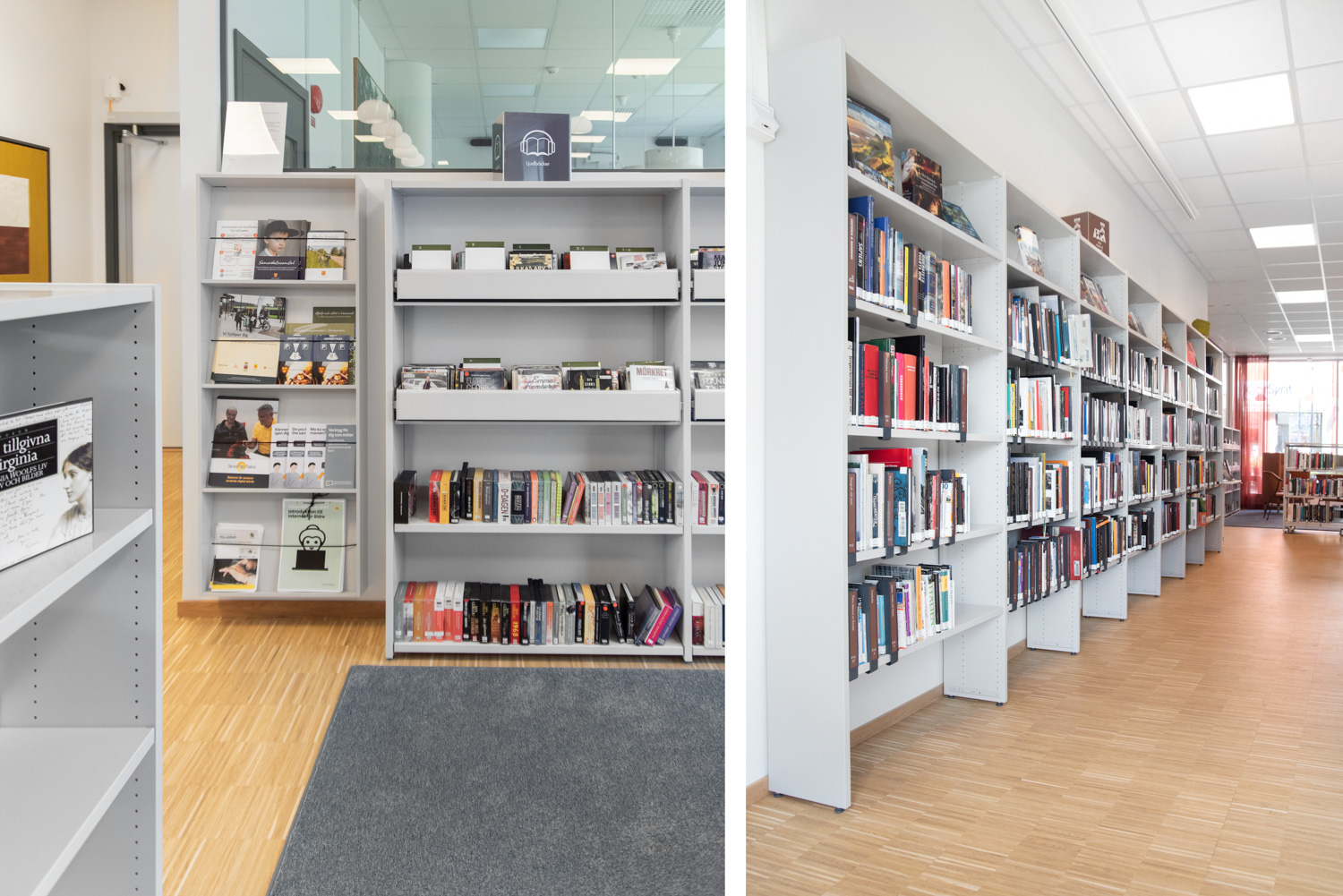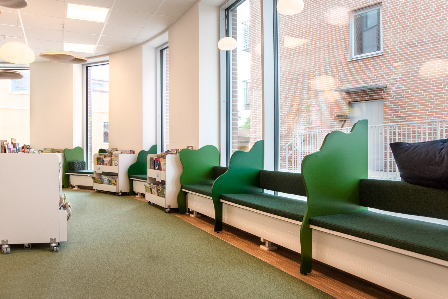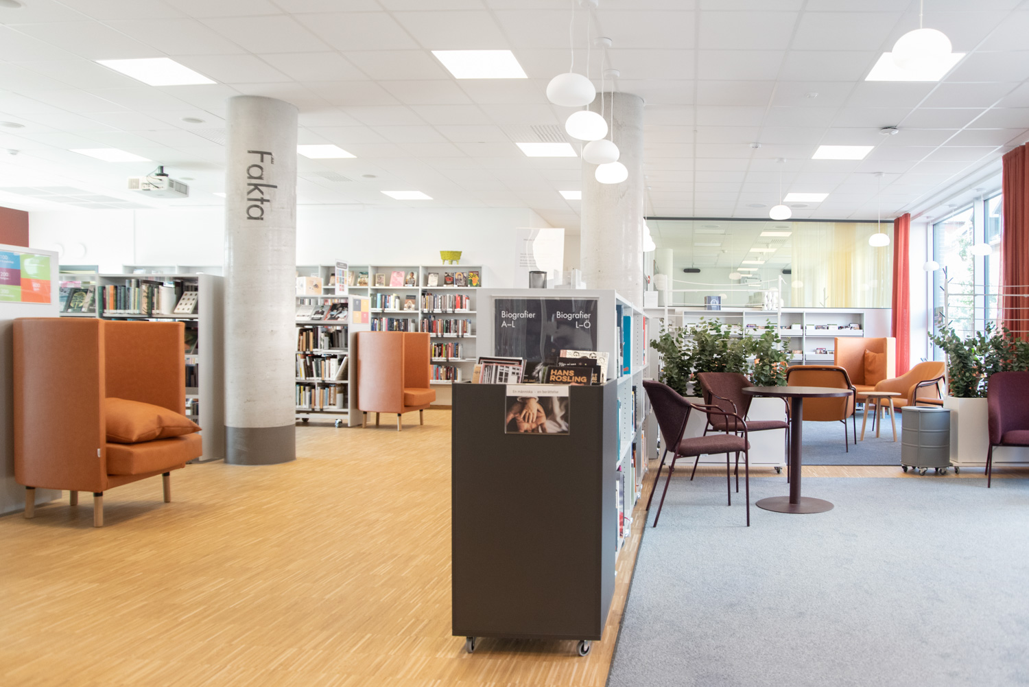 Resultatet är en blandning av café-stämning, kreativa kontorsmiljöer och kopplingar till det lokala näringslivet och naturen som präglar området. Den råa och lekfulla färgskalan ger det nya biblioteket en säregen och informell stämning som gör att alla känner sig välkomna.