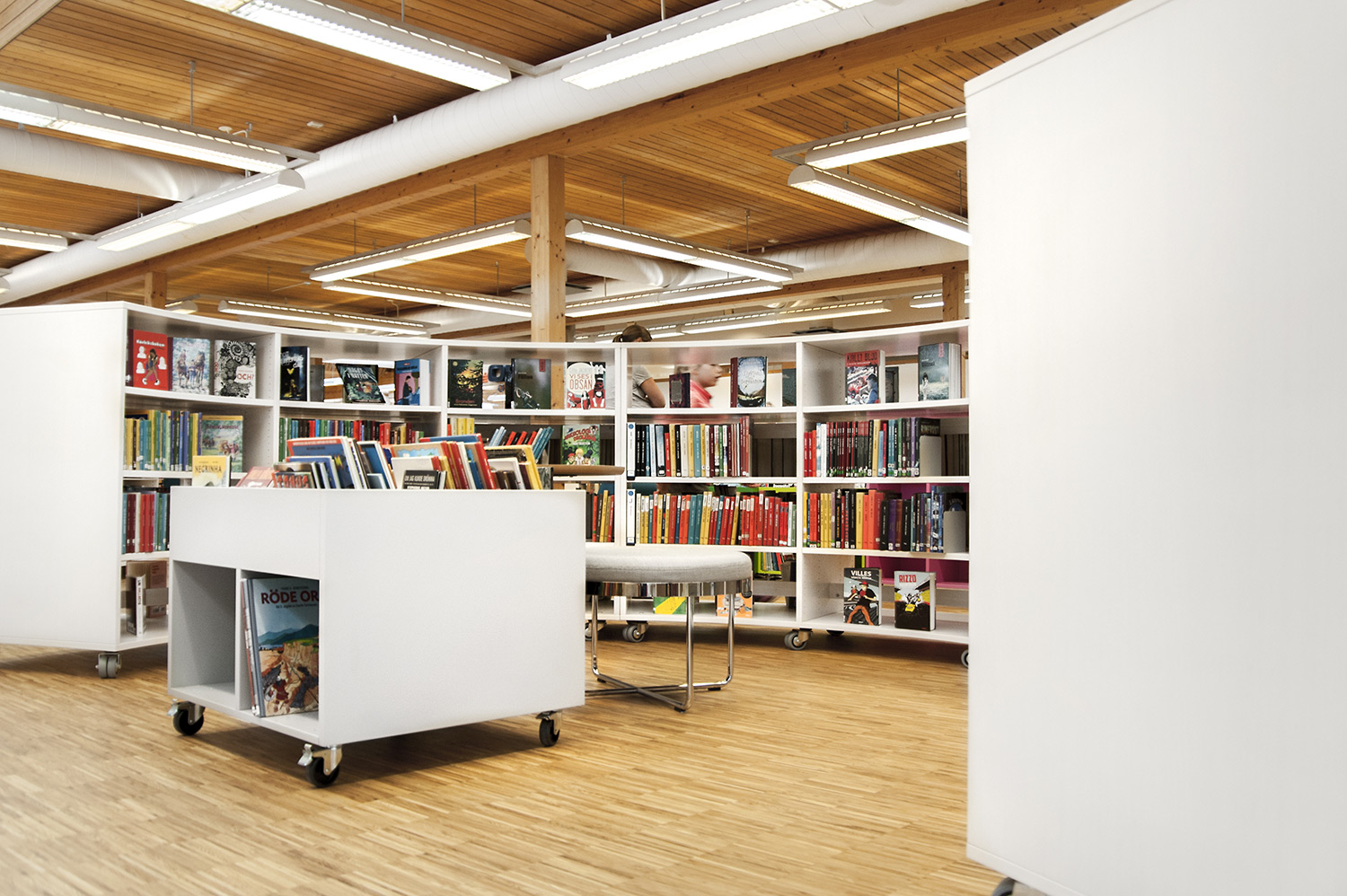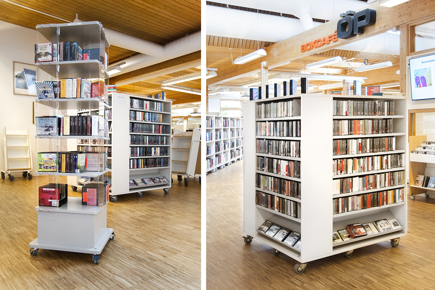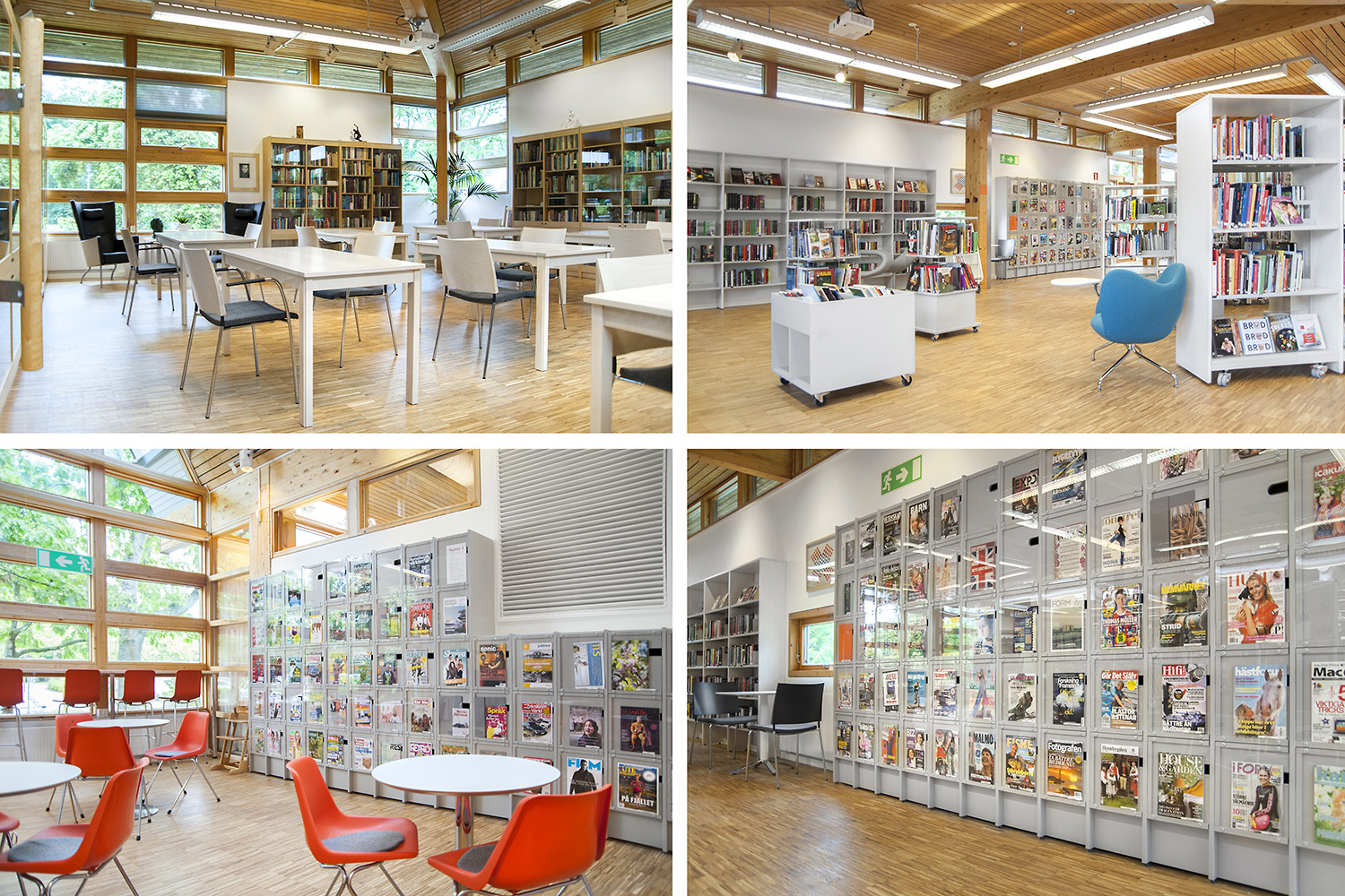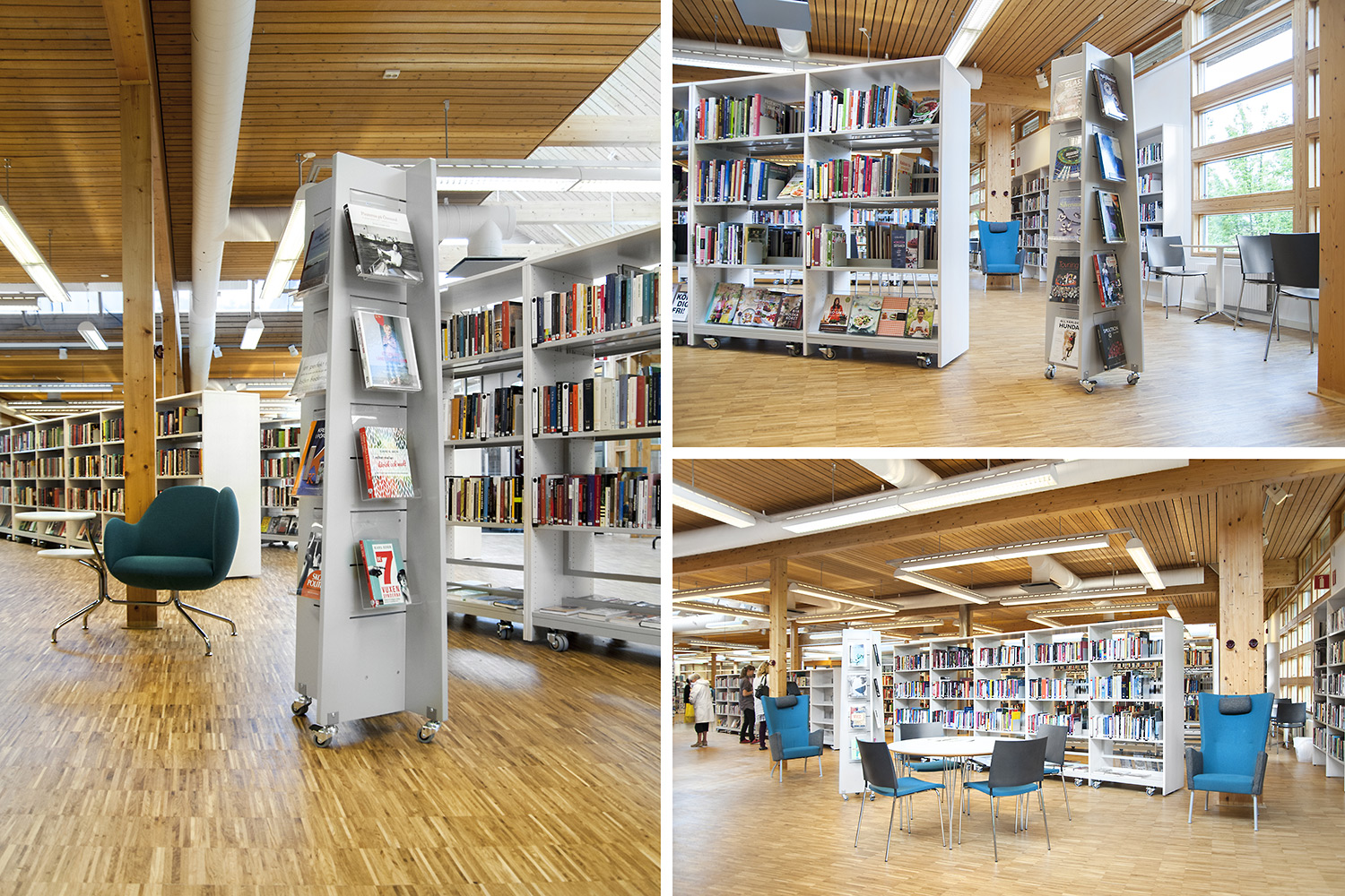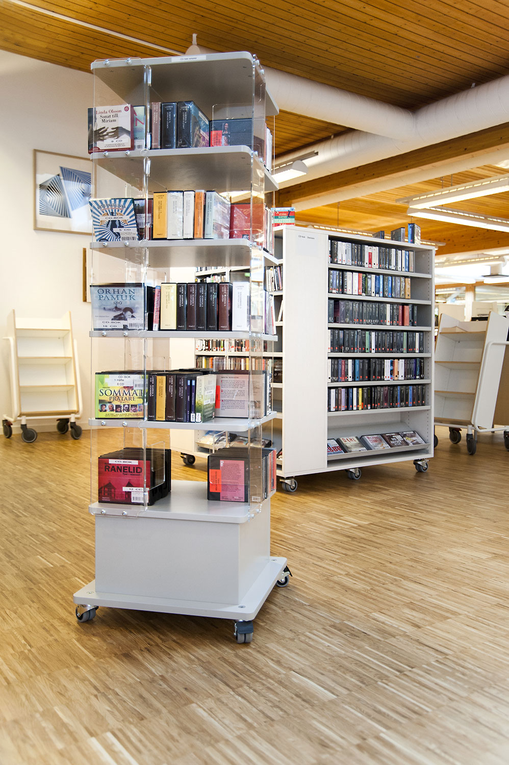 Alla Frontlinehyllor är försedda med hjul för bästa flexibilitet och kan flyttas vid föreläsningar och kulturarrangemang. Ordrup tidskriftshylla pryder sin plats och gör sitt innehåll lättillgängligt medan InfoPodar med inbyggd LED-belysning är placerade vid entrén om man vill rådfråga personalen om något. För fristående exponering av ljudböcker använder man Book Tower på hjul.