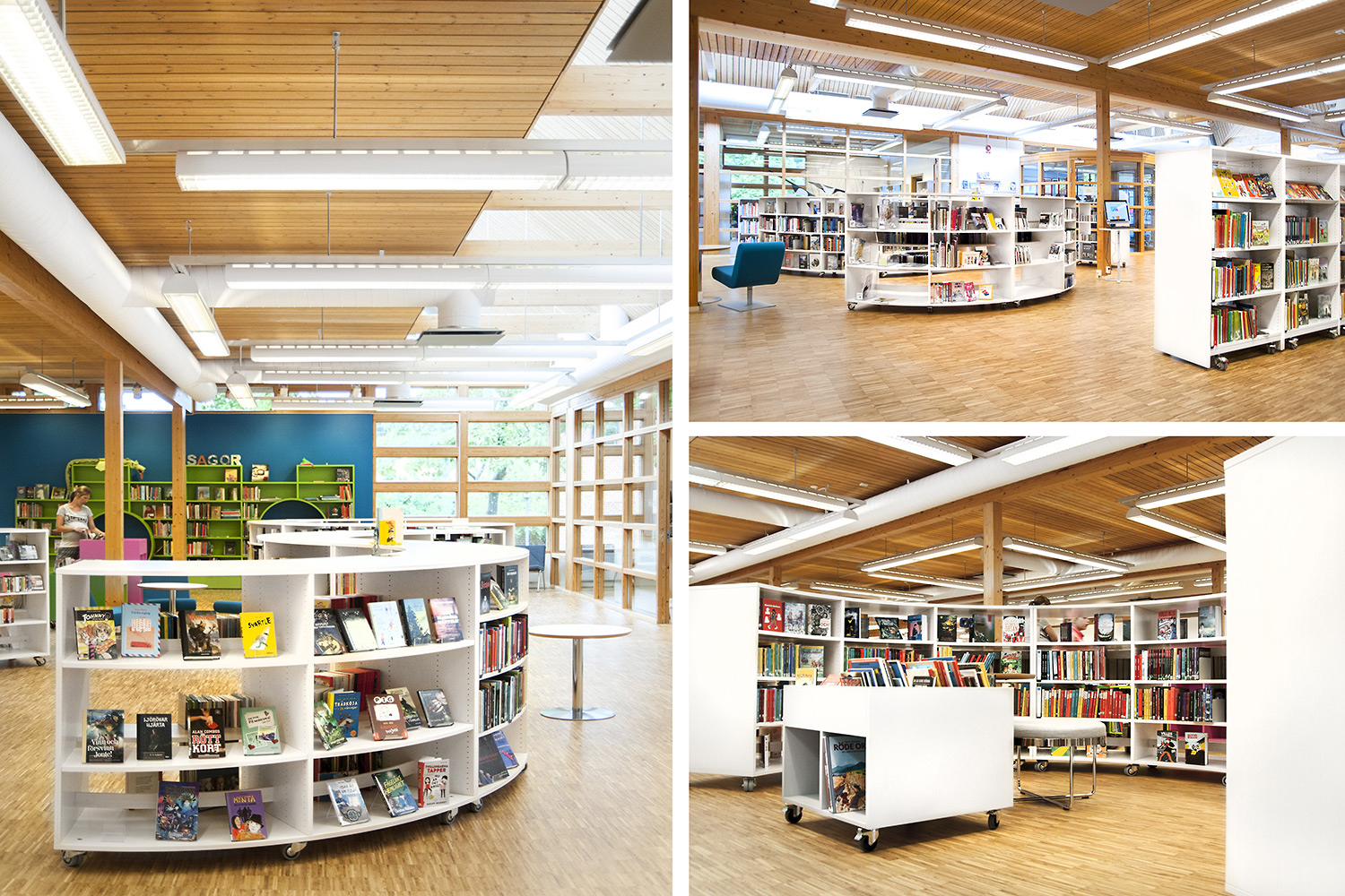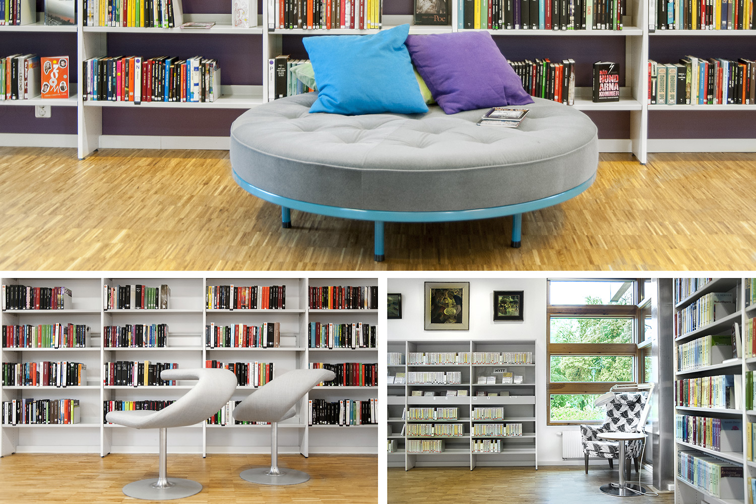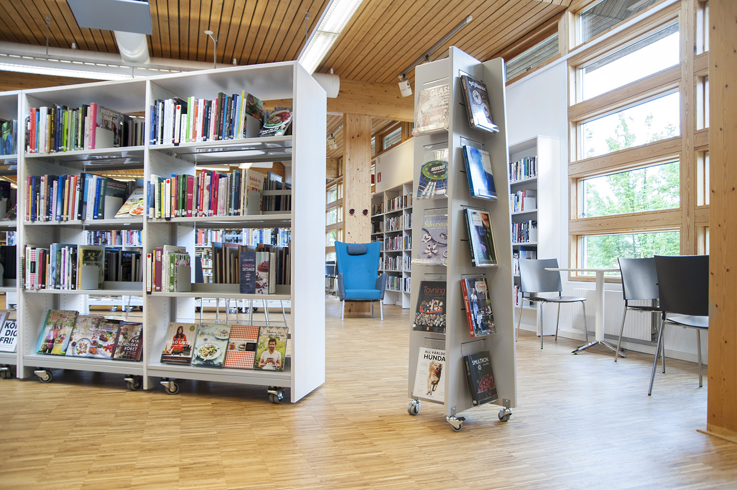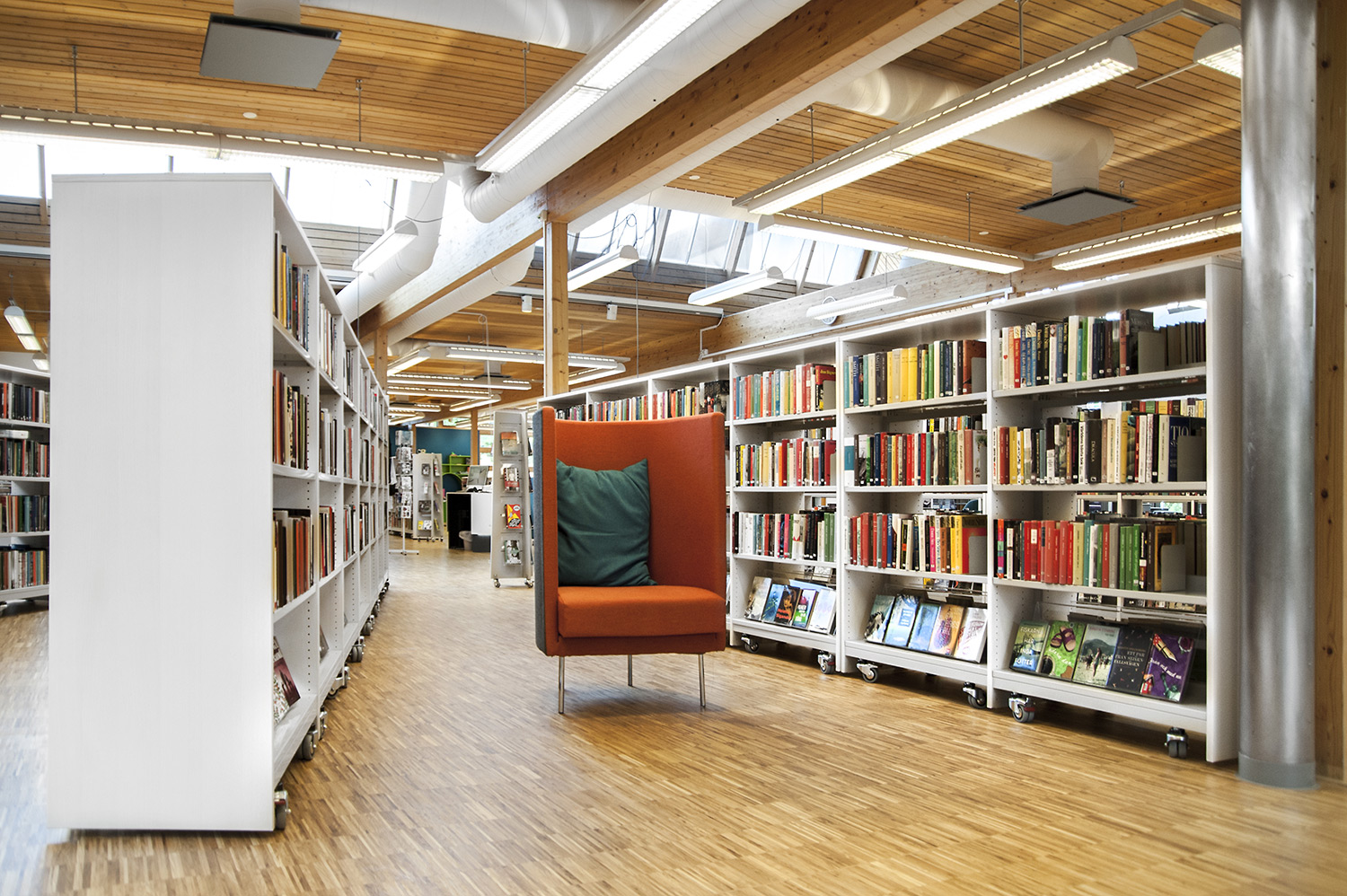 Alla Frontlinehyllor är försedda med hjul för bästa flexibilitet och kan flyttas vid föreläsningar och kulturarrangemang. Ordrup tidskriftshylla pryder sin plats och gör sitt innehåll lättillgängligt medan InfoPodar med inbyggd LED-belysning är placerade vid entrén om man vill rådfråga personalen om något. För fristående exponering av ljudböcker använder man Book Tower på hjul.