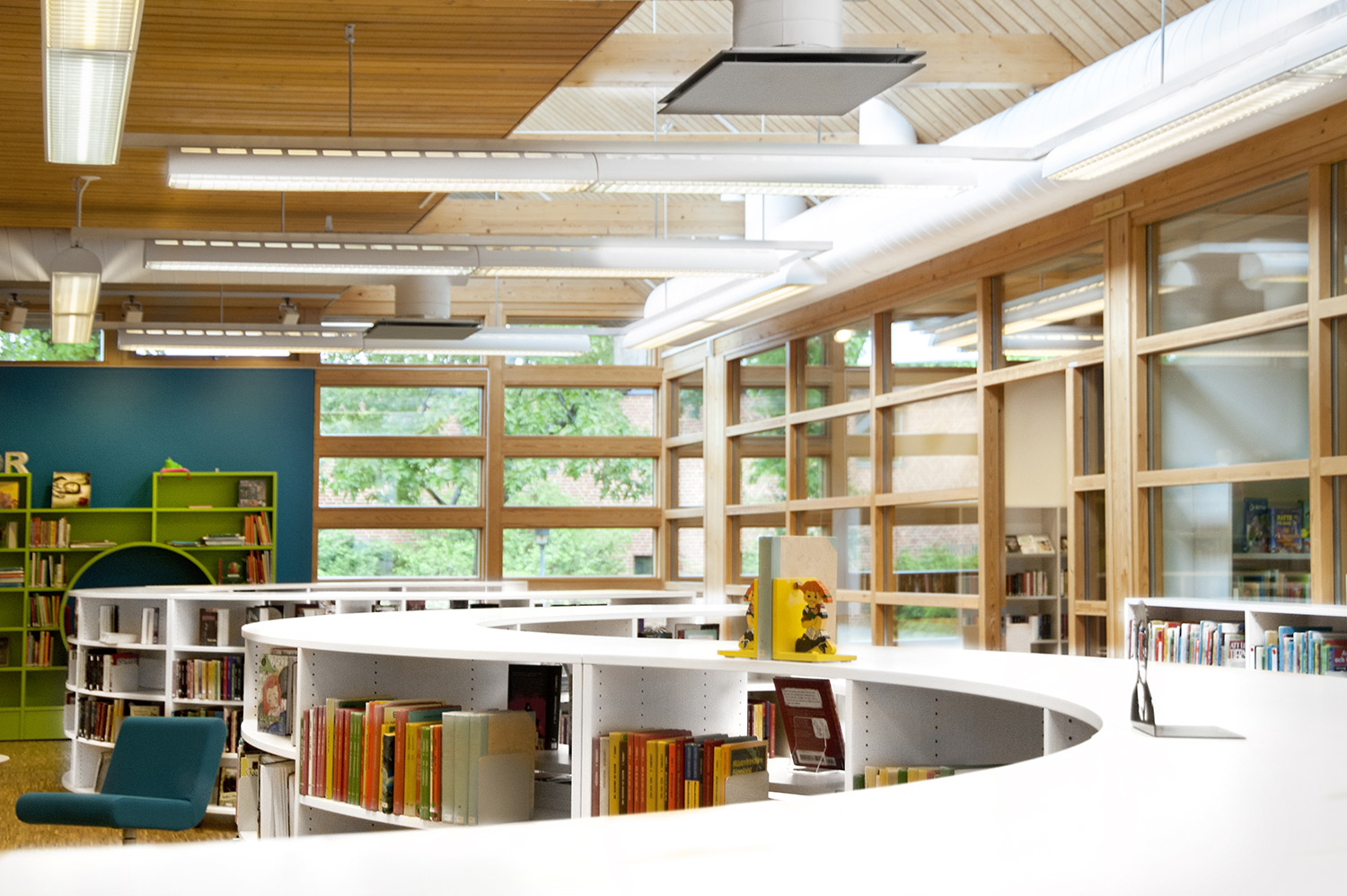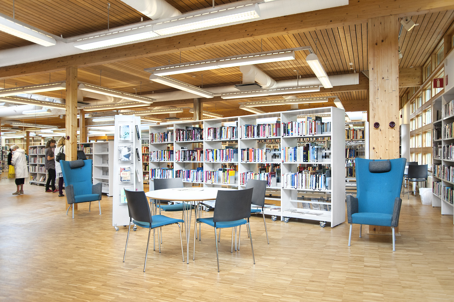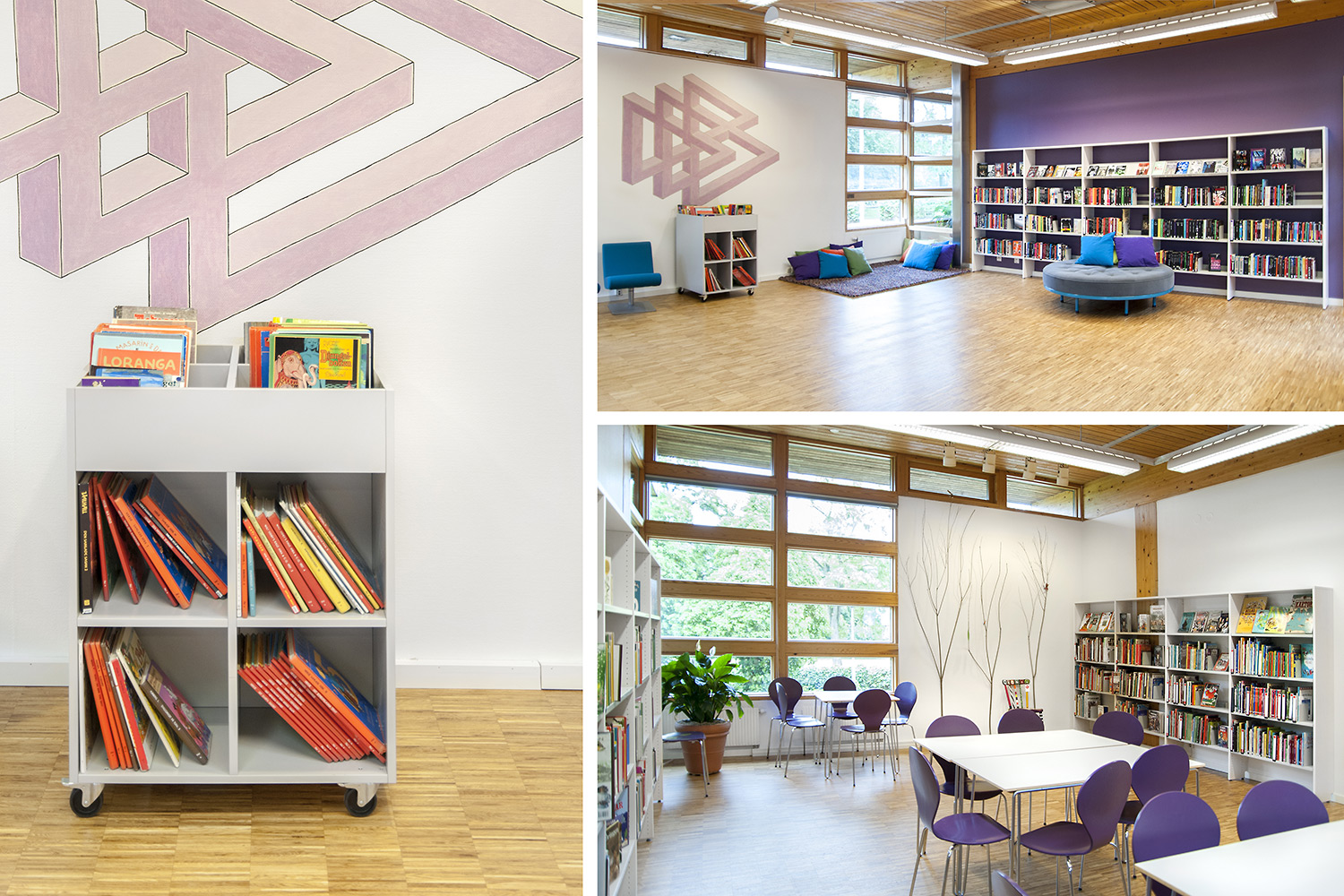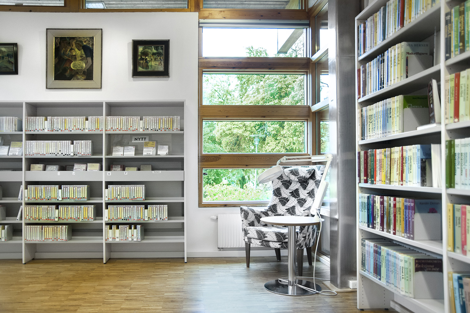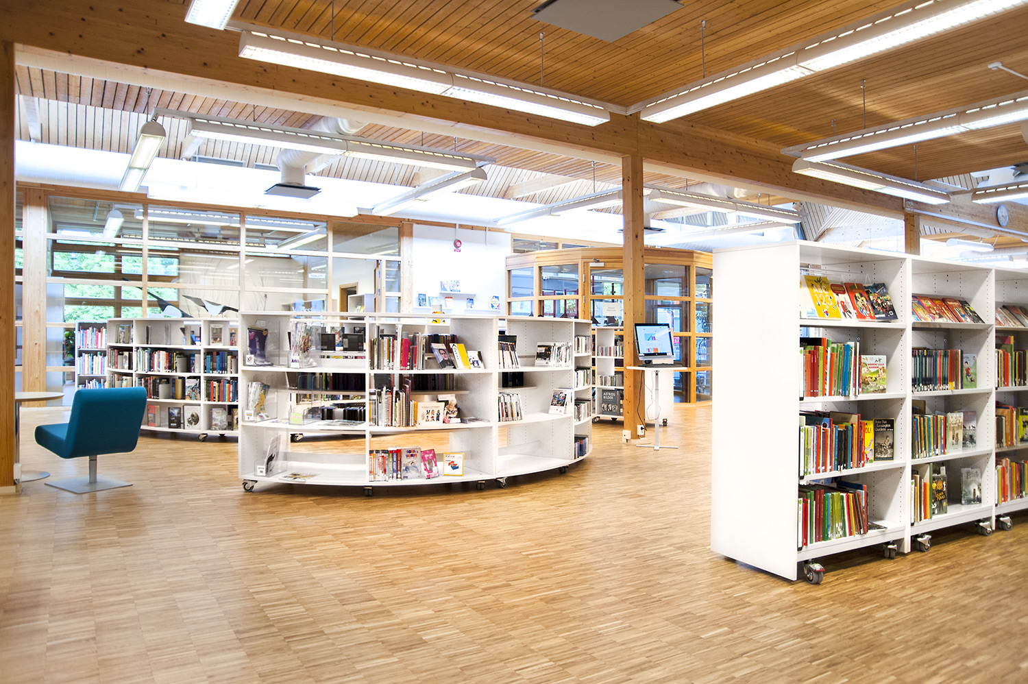 Alla Frontlinehyllor är försedda med hjul för bästa flexibilitet och kan flyttas vid föreläsningar och kulturarrangemang. Ordrup tidskriftshylla pryder sin plats och gör sitt innehåll lättillgängligt medan InfoPodar med inbyggd LED-belysning är placerade vid entrén om man vill rådfråga personalen om något. För fristående exponering av ljudböcker använder man Book Tower på hjul.