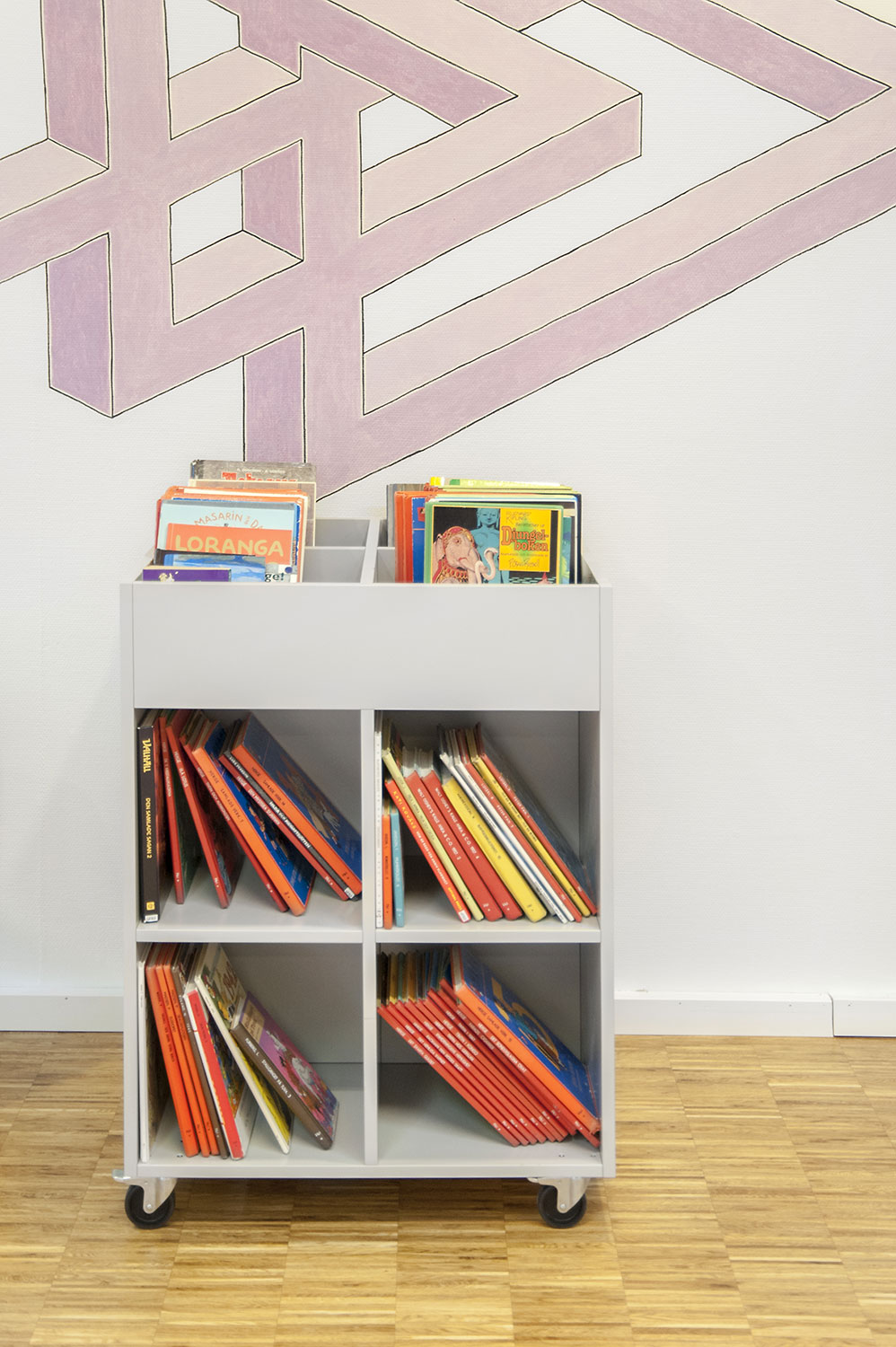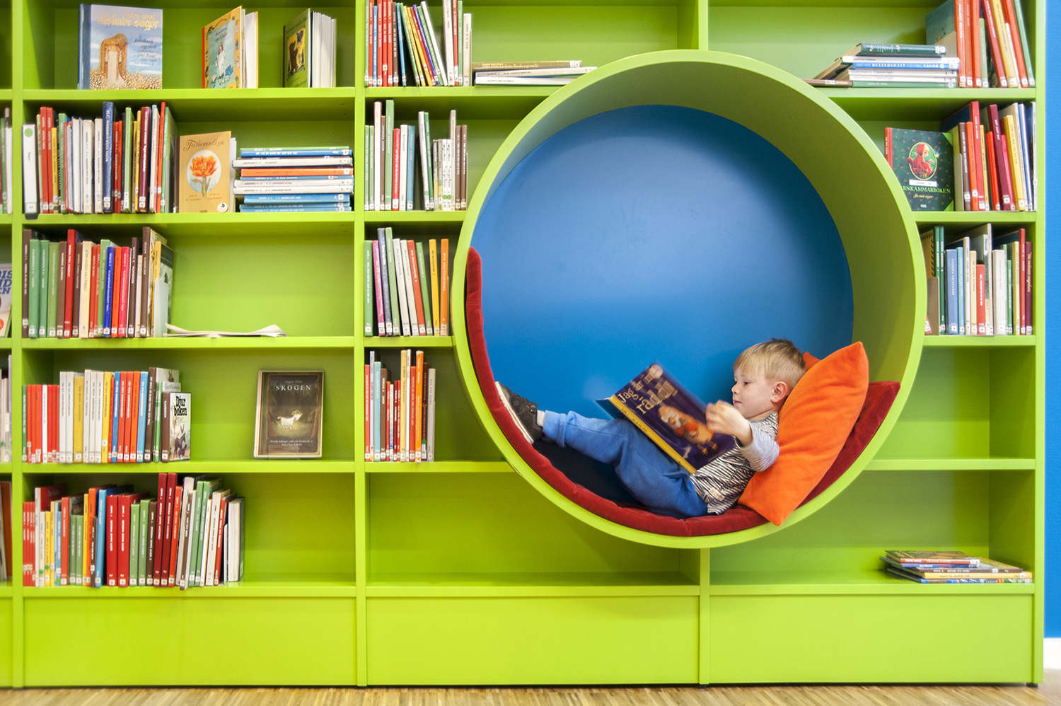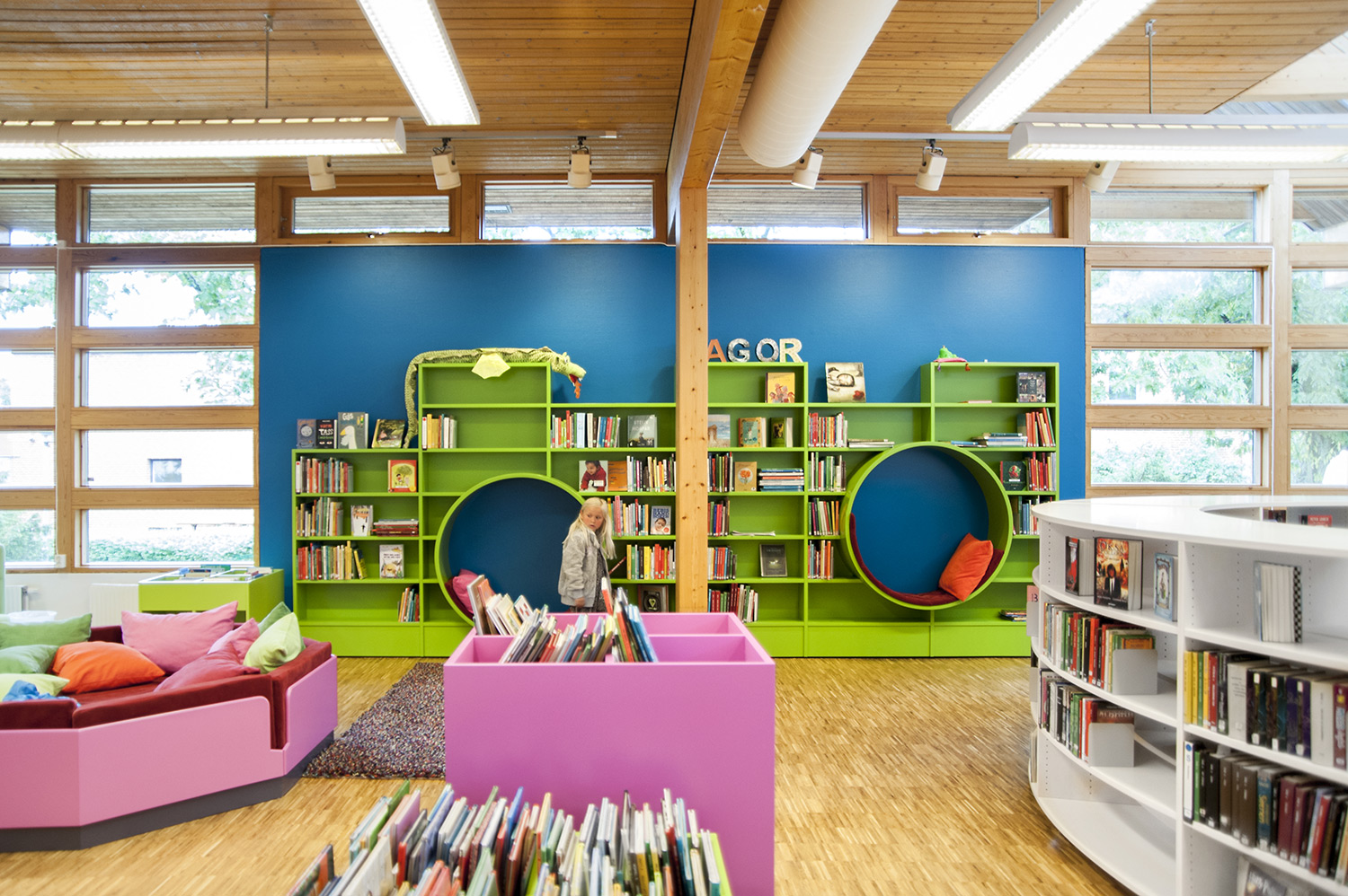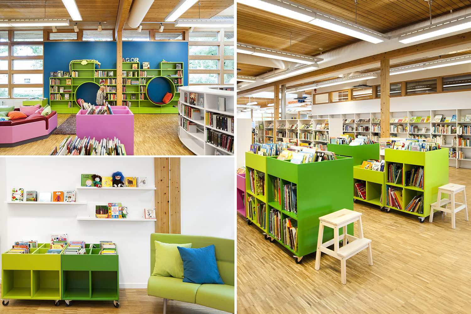 Man har satsat extra mycket på att få den nya barnavdelningen attraktiv för de yngre; bland annat den stora bokhyllan i klara färger med integrerade sittplatser inbjuder till läsning tillsammans med sittplatser och områden där barn och unga ska kunna känna sig bekväma.