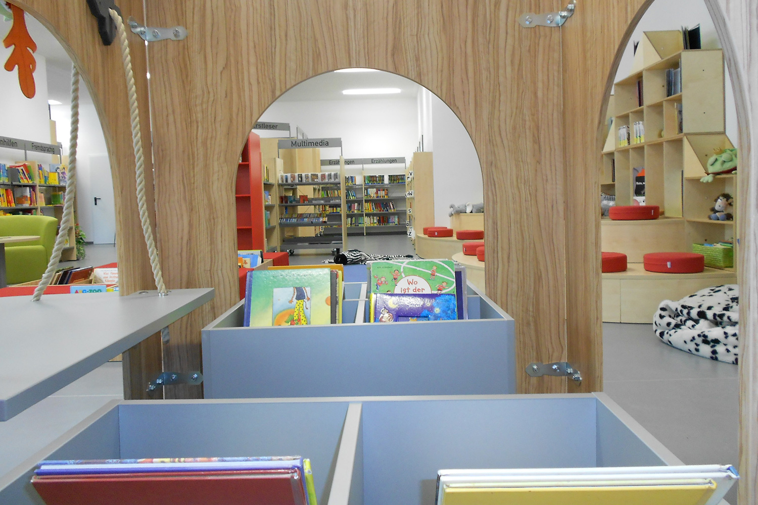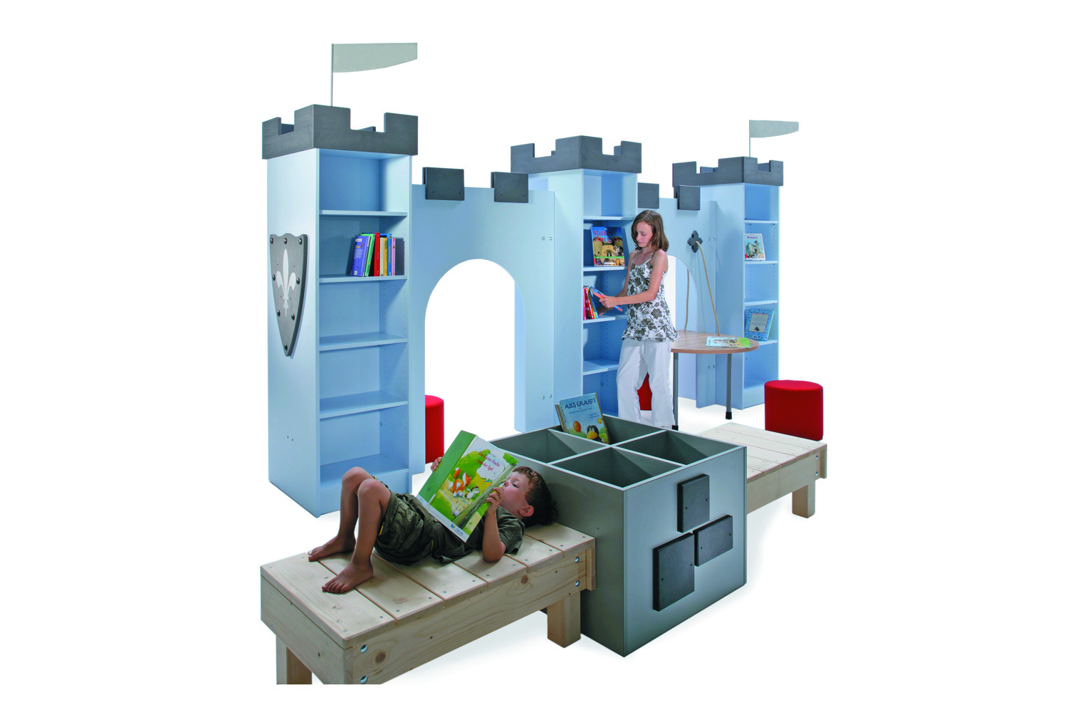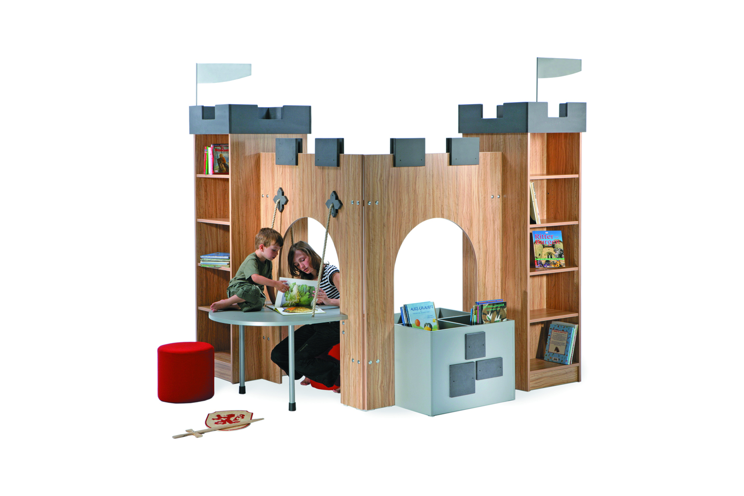 Borgen är perfekt för att förvara böcker på ömse sidor om tornen och det stabila hängbrobordet skapar kungligt utrymme för både lek och allvar. Slottstornen och den välvda porten kan kompletteras med sittpuffar, sittkuddar eller bilderbokslådor i olika höjder för att passa olika åldersgrupper.