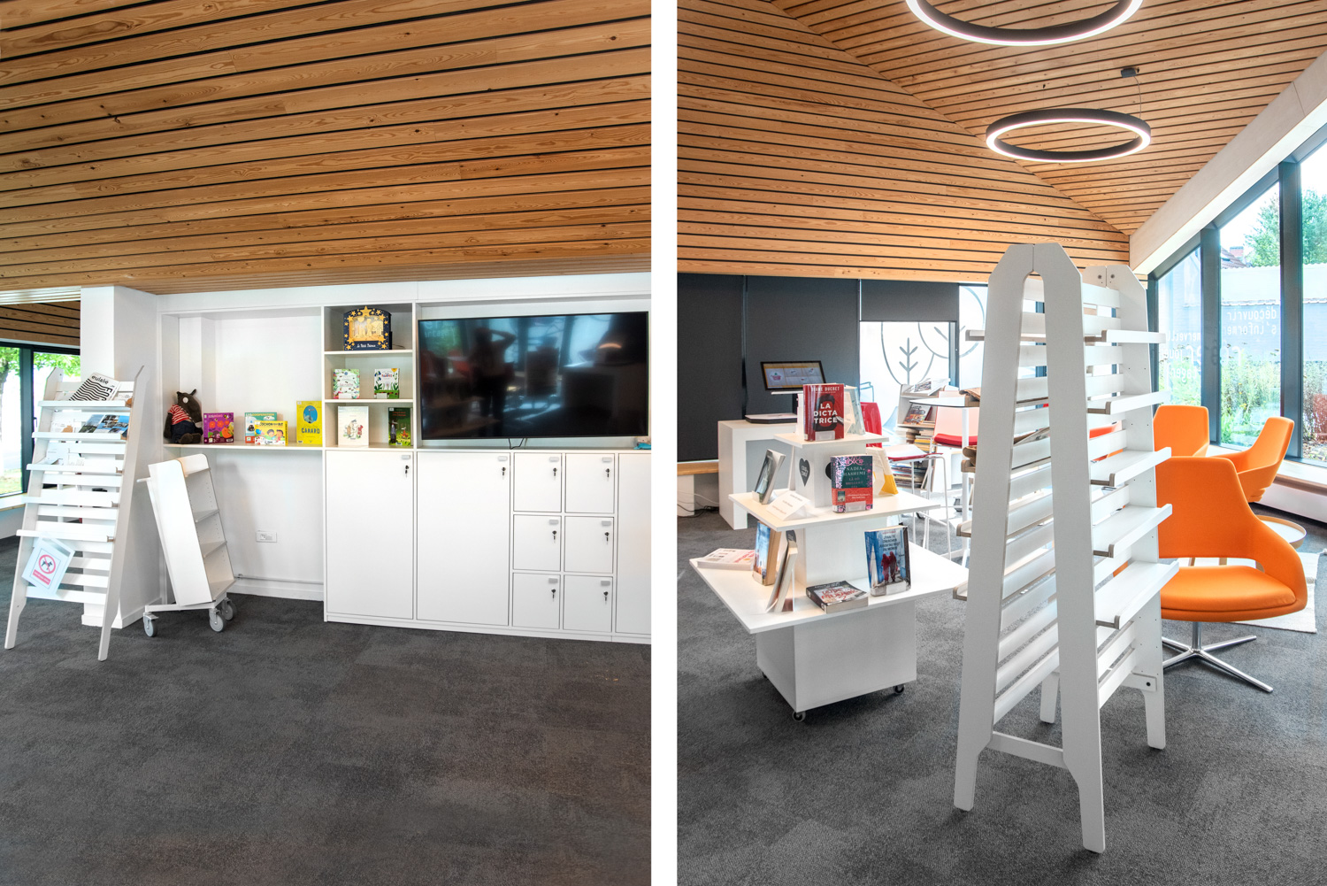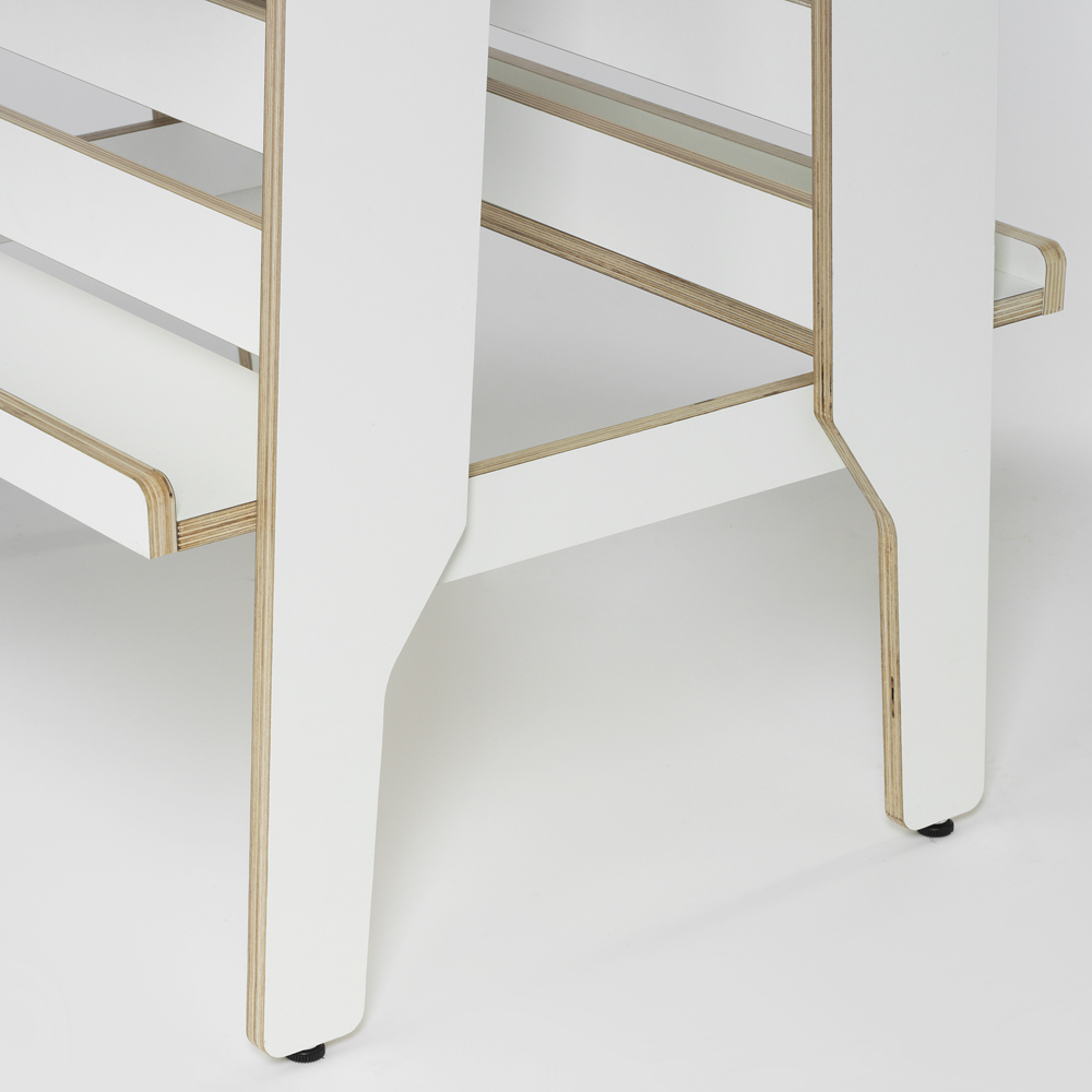 Vi talar laminerad björkplywood; här med synliga kanter. Allt för att få en såväl tålig yta som hållbar konstruktion. Perfekt för de mest krävande biblioteksmiljöerna!