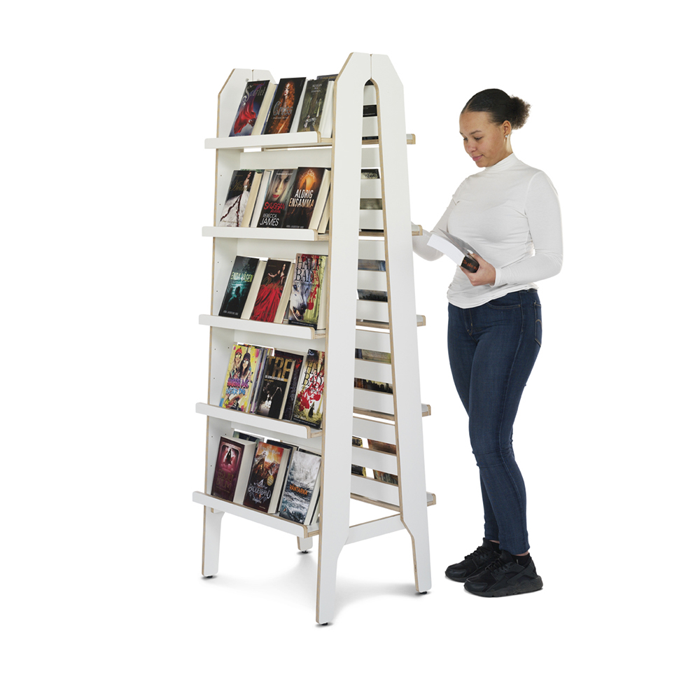 När du vill visa allt och lite till… Dubbelsidig Showalot Ladder, här som ett färdigt paket för dig som vill ha en fristående enhet . Allsidiga, flexibla och byggbara moduler för frontexponering av böcker och bilderböcker eller till förvaring av pocketböcker, talböcker med mera. Går även att dela på och använda varje del lutad mot vägg. Utrustad med 10 flyttbara hyllplan med framkantslist (hyllplanen är något justerbara i djupled). Ändra och flytta runt allt efter behov.