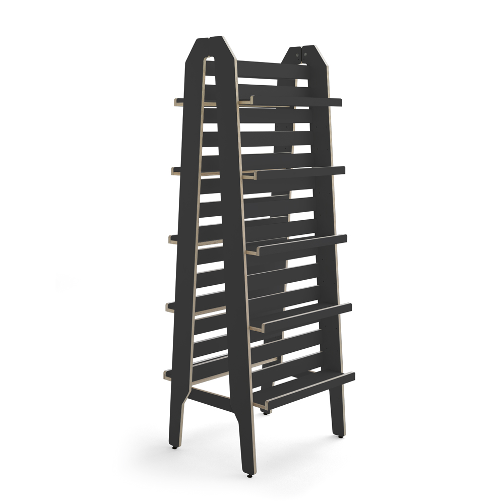 När du vill visa allt och lite till… Dubbelsidig Showalot Ladder, här som ett färdigt paket för dig som vill ha en fristående enhet . Allsidiga, flexibla och byggbara moduler för frontexponering av böcker och bilderböcker eller till förvaring av pocketböcker, talböcker med mera. Går även att dela på och använda varje del lutad mot vägg. Utrustad med 10 flyttbara hyllplan med framkantslist (hyllplanen är något justerbara i djupled). Ändra och flytta runt allt efter behov.