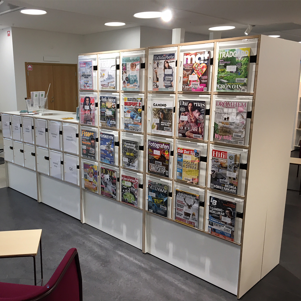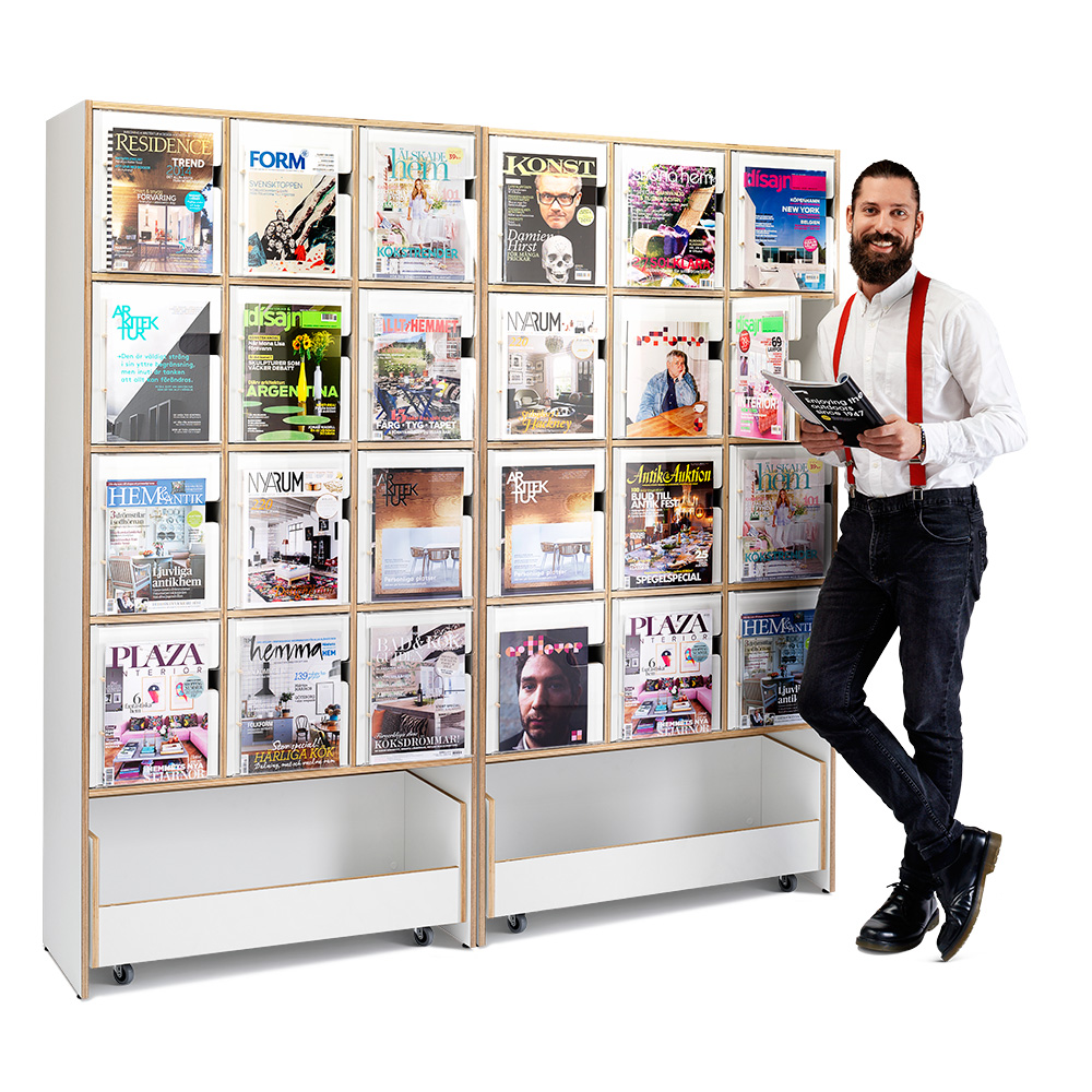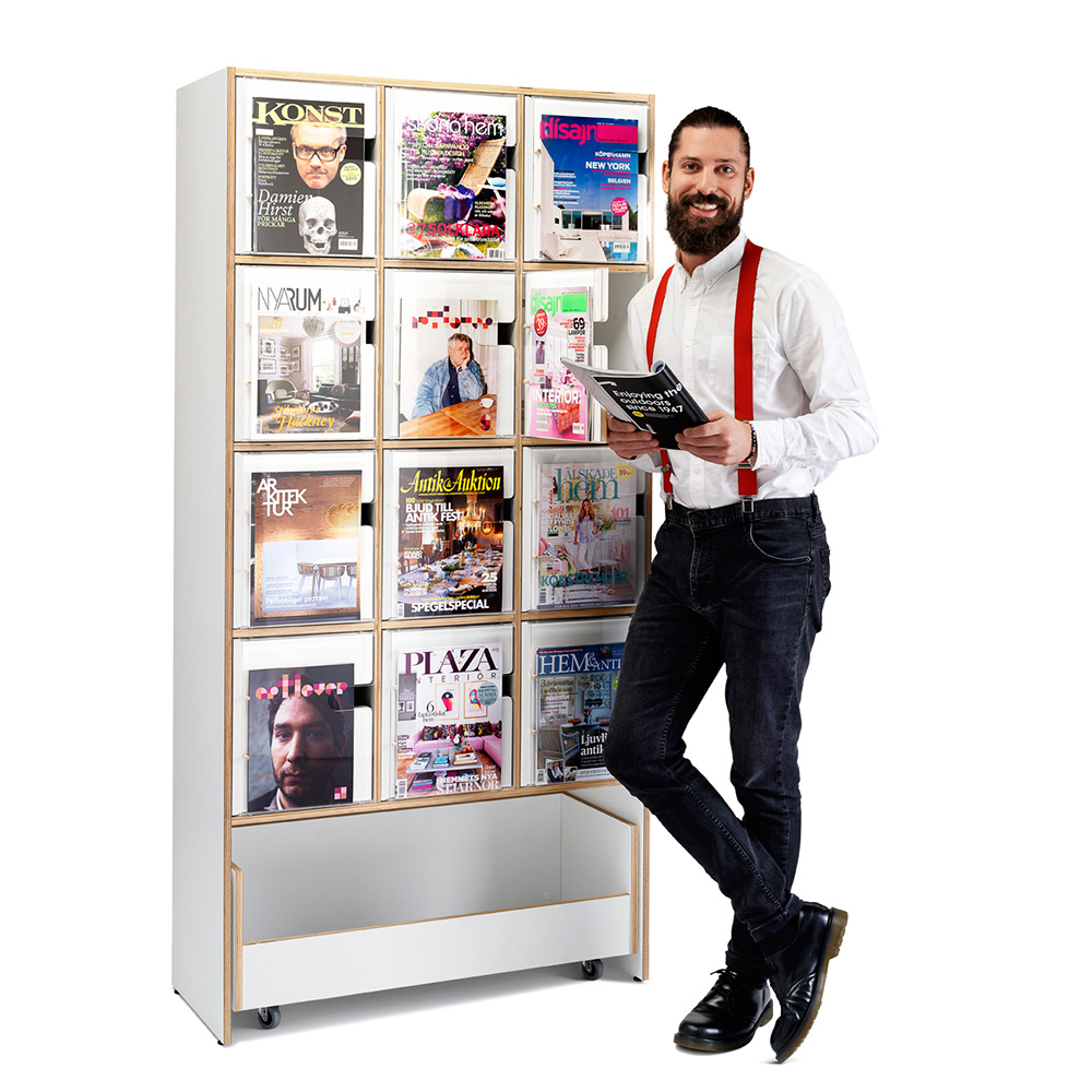 Nätt, slimmad exponerings- och förvaringsmöbel för tidskrifter, magasin eller andra seriella publikationer. Skåpsluckor med front i akryl för exponering. Generöst exponeringsdjup tillåter exponering även för tjockare tidskrifter.