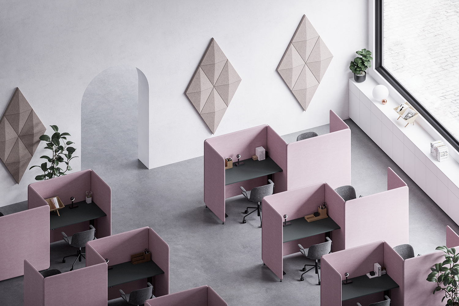 Funktionellt, flexibelt och ljudabsorberande skärmsystem i moduler; rumsavdelare och ljudabsorbenter i ett för miljöer med hög ljudbelastning ger den högsta möjliga ljudabsorption (ljudklass A).