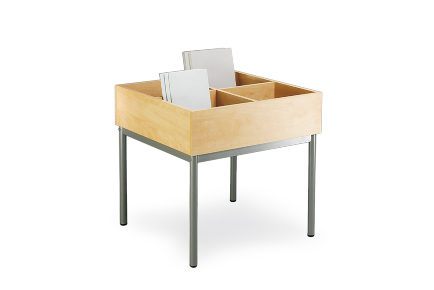 Denna exponeringstråg finns i fyra olika höjder och kan användas kreativt för att skapa en zonindelande effekt. När de placeras bredvid varandra skapar de ett område för en stor mängd böcker och ger god översikt över materialet.