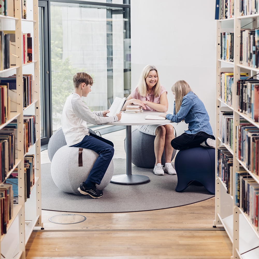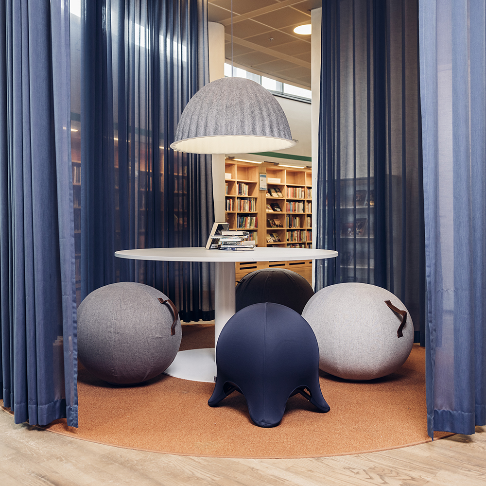 Ett perfekt komplement eller direkt alternativ till vanliga stolar och samtidigt en liten skulptural möbel som smälter in överallt i biblioteksinredningen, till exempel i studiemiljöer och sittgrupper men också för en liten paus mellan bokhyllorna.