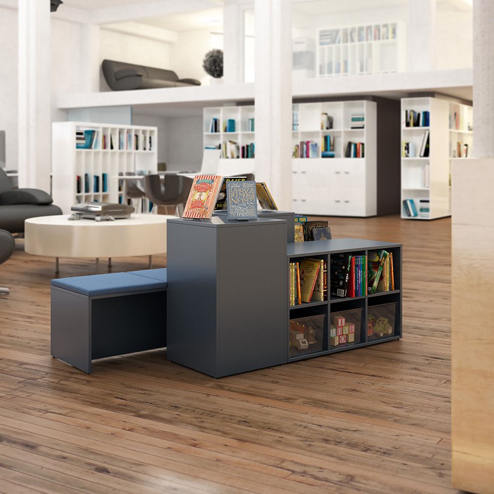 Svea är ett funktionellt och platsbesparande förvaringspodium som håller material organiserat och lättillgängligt. Med sex fack anpassade för plastlådor gör Svea det enkelt att sortera, förvara och nå böcker och läromedel.