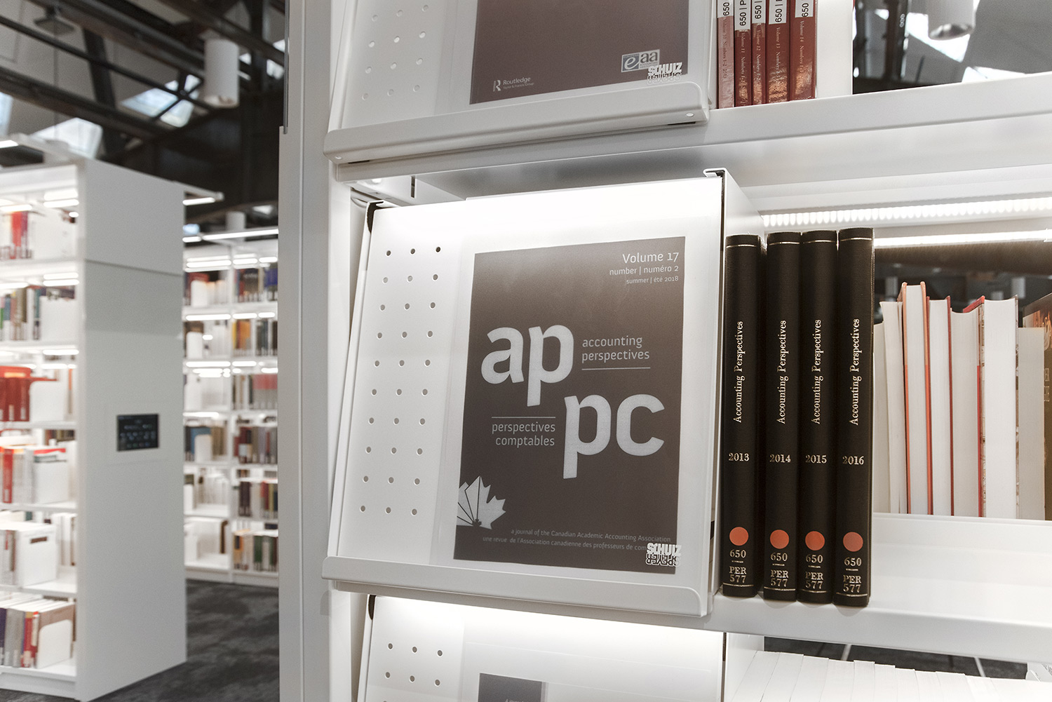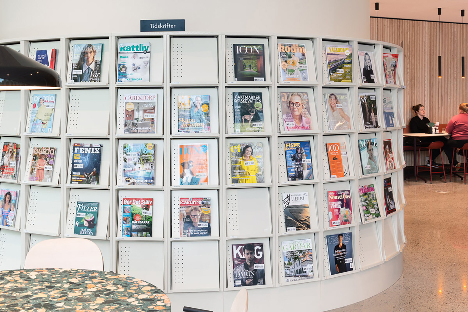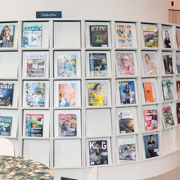 Frontexponerar tidskrifter i en lättläst vinkel och där eponerad tidskrift hålls på plats med en transparant täckfolie som täcker klaffen. Enkelt att byta.