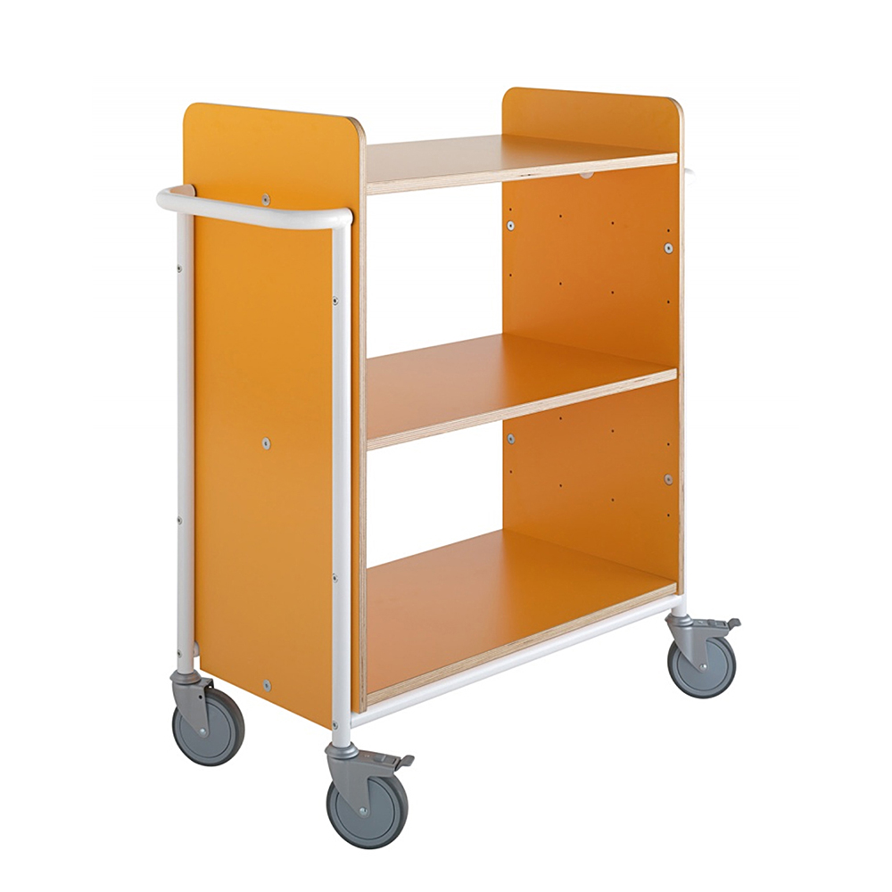 Rymlig bokvagn/transportvagn med generöst utrymme mellan hyllplan. Lämplig för alla bokstorlekar och pärmar.