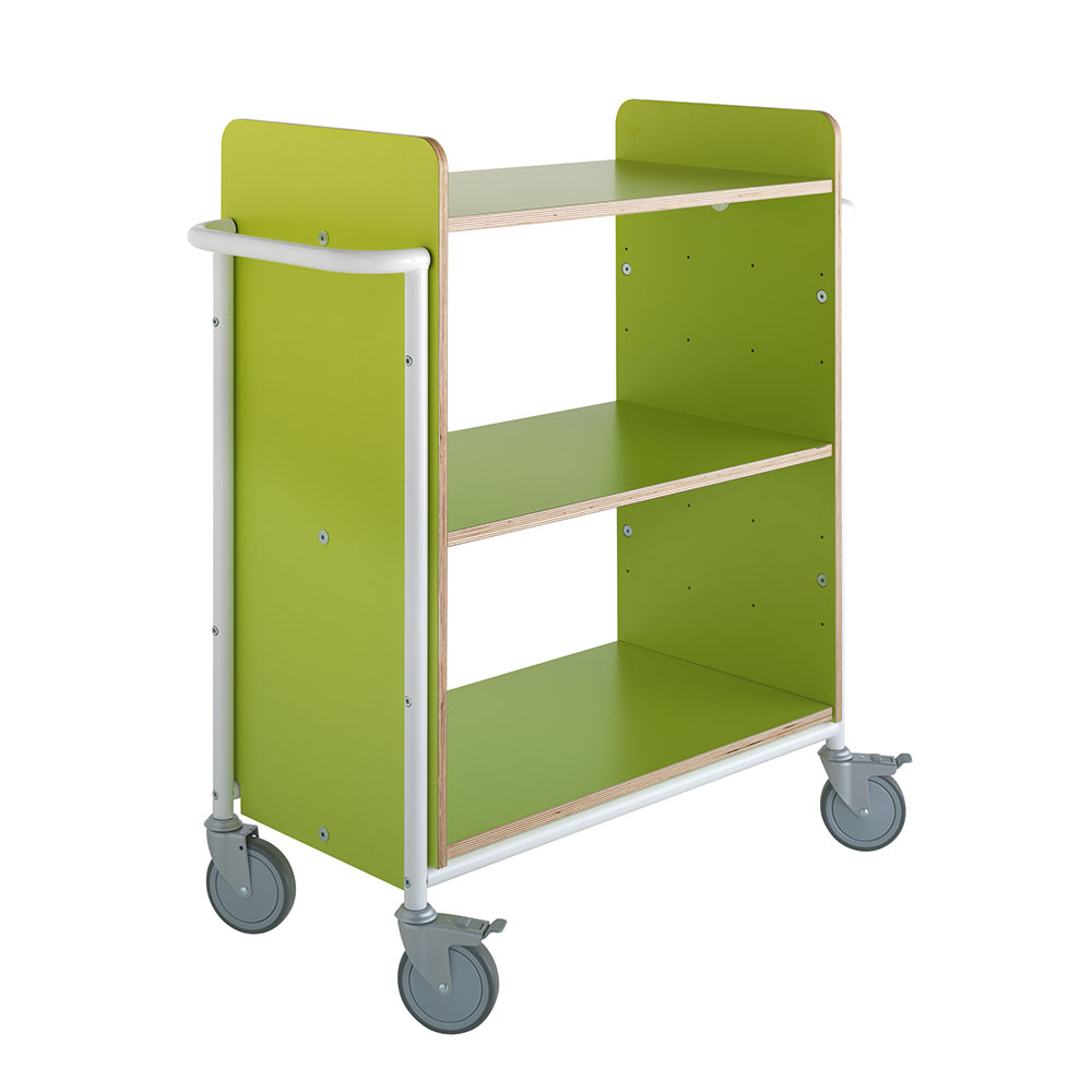 Rymlig bokvagn/transportvagn med generöst utrymme mellan hyllplan. Lämplig för alla bokstorlekar och pärmar.