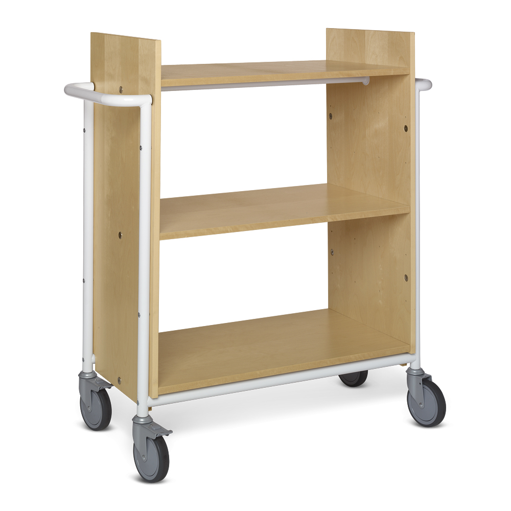 Rymlig bokvagn/transportvagn med generöst utrymme mellan hyllplan. Lämplig för alla bokstorlekar och pärmar.